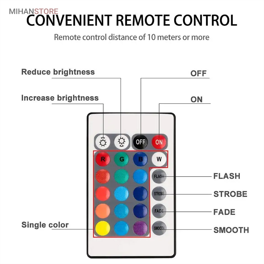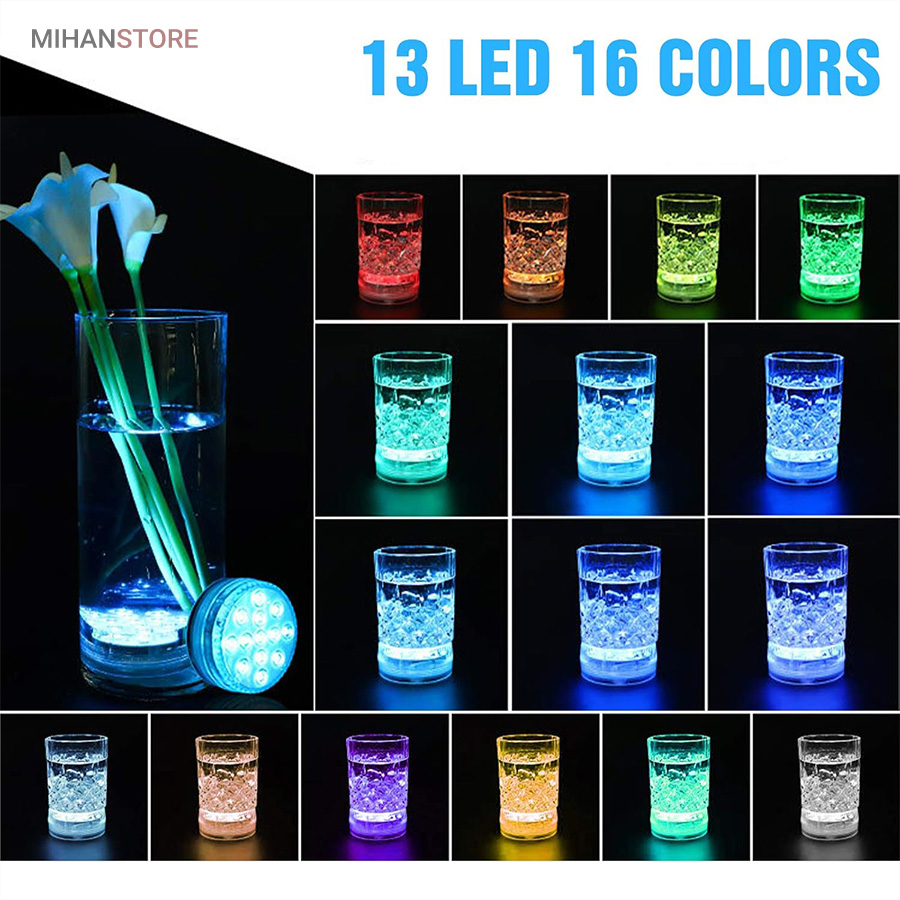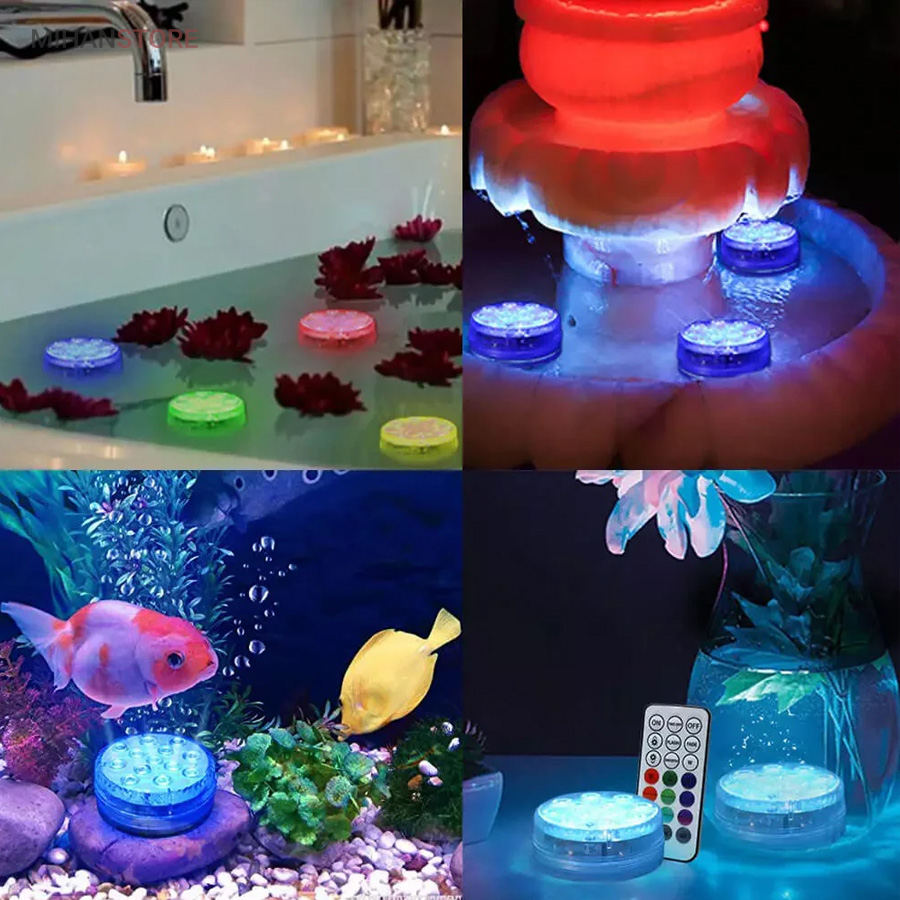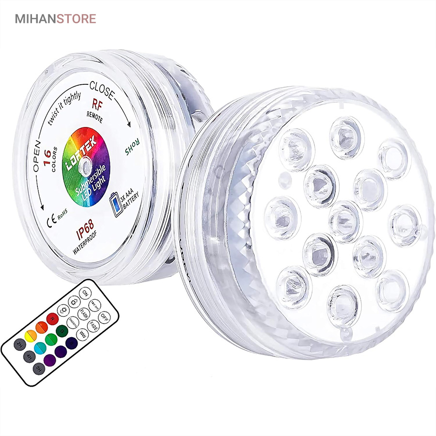 چراغ LED ریموت دار ضد آب دارای LED RGB قابلیت تولید انواع رنگها را دارد. ضمنا با توجه به داشتن ریموت کنترل امکان کنترل از راه دور را فراهم میکند. این پک LED می تواند رنگها و نورها را بصورت مستقل و یا ترکیبی و با حالتهای متفاوت در سرعت چشمک زدن و تغییر رنگها از طیفی به طیف دیگر برای ایجاد جذابیت تولید نماید. با استفاده از 3 عدد باتری نیم قلمی امکان کار تا 72 ساعت بصورت مداوم برای این لامپ وجود دارد.